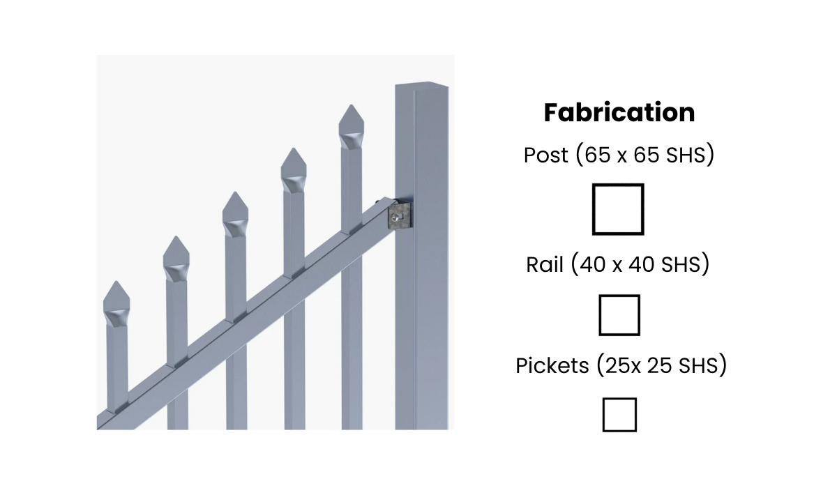 Specify pale length, rail spacing, and post centres to suit your site and security level.